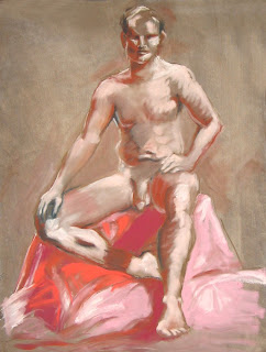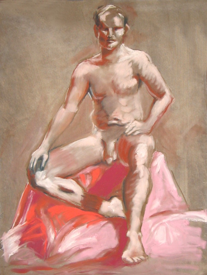 love! the use of reds and warms in the third drawing ... that red sheet really got us going. I did a red/orange/yellow drawing last night. Not your normal manly colors. Your second drawing looks stiff and caveman-like ... which, in this case is very accurate. First drawing is very nice! yeah!