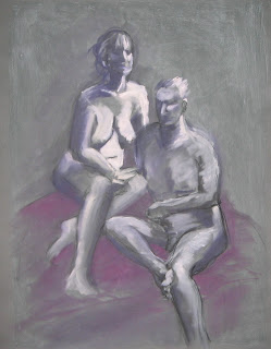 It is a challenge to draw even one figure sometimes, two figures can be overwhelmingly complex. So the thing to do that works for me is to simplify, simplify. This drawing was the second of three - the first was a 20-minute charcoal, this one was 30 minutes (?), and the last was about an hour with a break in the middle. While this drawing is stiff partly because of the inaccuracies and partly in the apprehensive rendering, I do like the simple blocks of color. - Not too much finish, or too much detail.