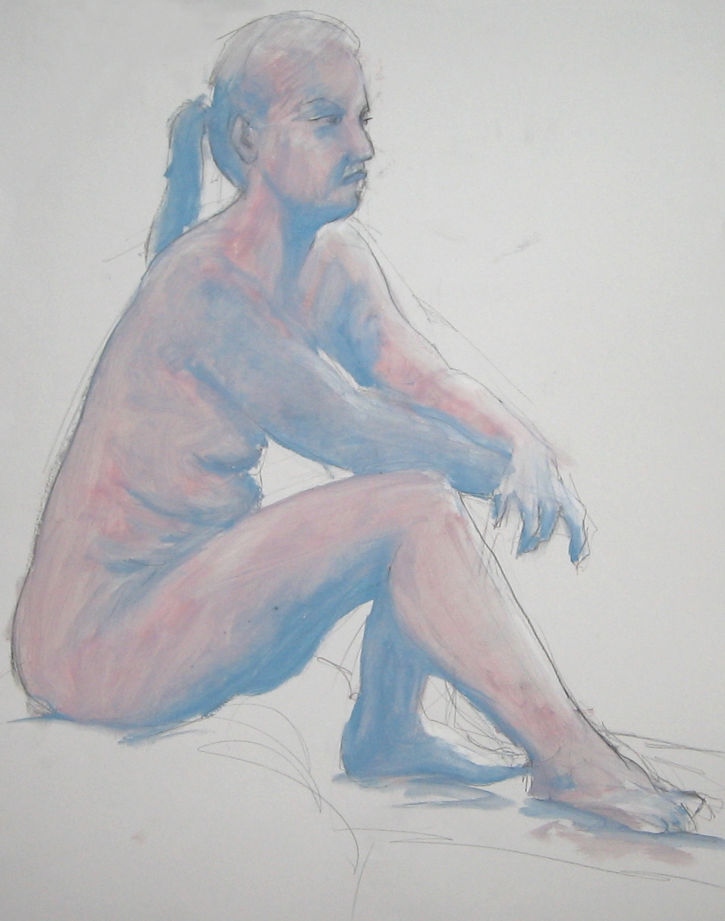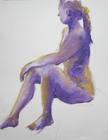 The intention I set for tonight was to challenge myself in a media I have used before but not too effectively and to use a complementary color palette to develop the figure. These first 2 are 15 minute drawings, starting out with charcoal sketch lines, then filled in with color on smooth drawing paper - no gesso. I feel like the drawings look stiff here - but it is the long warm-up - that's how I look at it.