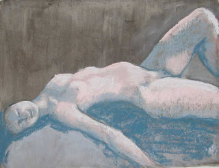 This on handmade pastel ground paper. It was almost like drawing upside down. I worked on it a bit in the studio. It has that weird light quality of that Lautrec opera singer poster. Upside down.
